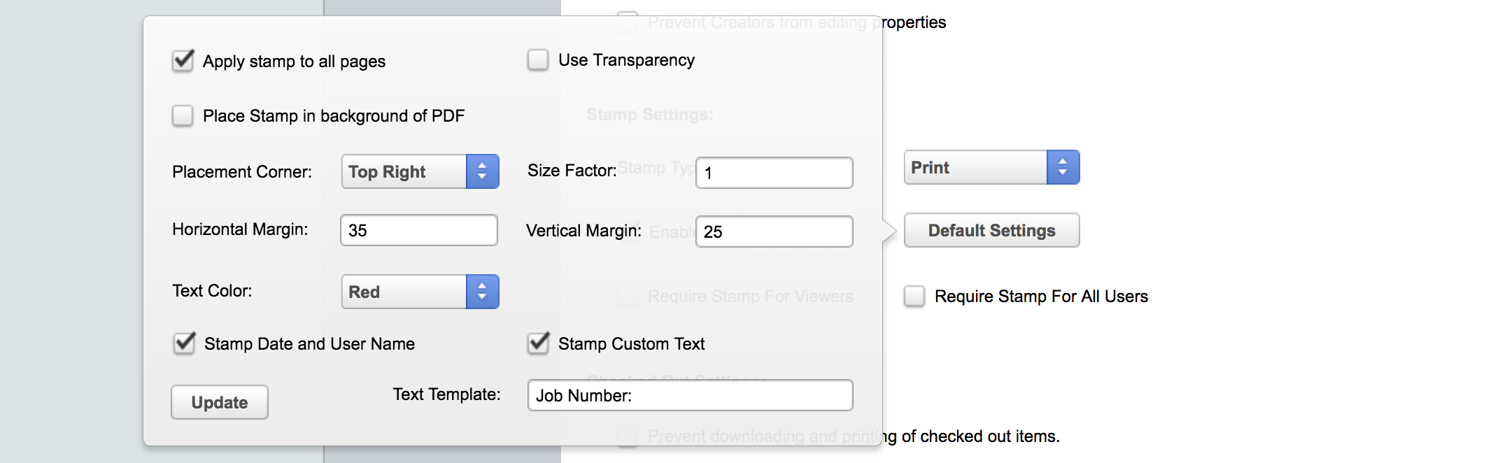 Once enabled, when a user clicks to print the item they will be prompted to ask if they want to stamp the item or not. If you would like, you can make the stamp required for Viewers by enabling the “Require Stamp For Viewers” option. You can also make the stamp required for all users by enabling the “Require Stamp For All Users” option. When creating a stamp, Flatter Files allows you to control exactly where it is placed on the drawing and the size. To control these settings simply click the button titled “Default Settings” which will display the settings shown in the image below.